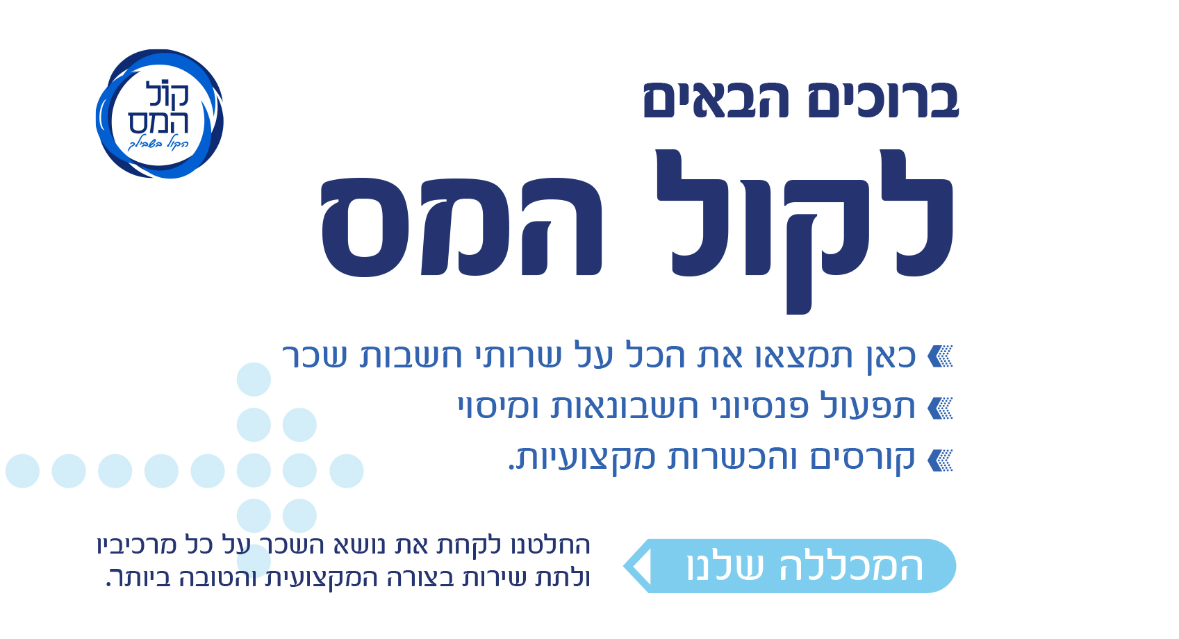 ברוכים הבאים לקול המס - כאן תמצאו את הכל על שרותי שכר, תפעול פנסיוני, חשבונאות ומיסוי ועוד.
